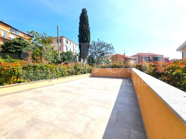 L'appartamento ci accoglie con un ingresso al piano terra adibito a salottino ed un bagno di servizio, la scala ci accompagna al primo piano dove troviamo il soggiorno con angolo cottura, perfetto per preparare deliziosi pasti da gustare sul terrazzo di 100mq presente nell'appartamento, una cameretta che affaccia anche essa sul terrazzo e la seconda camera con il suo affaccio su un balcone privato, sempre al piano troviamo un secondo bagno finestrato molto accogliente.